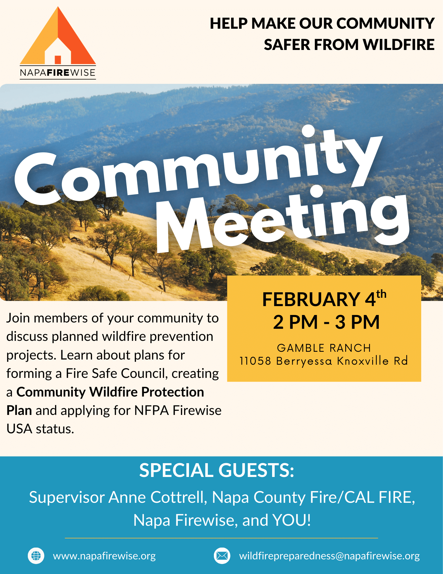 Please join members of the community together with Napa Firewise, Supervisor Anne Cottrell, Napa County Fire and others to learn about planned wildfire prevention projects, and how forming a Fire Safe Council and developing a Community Wildfire Protection Plan (CWPP) can help our community reduce wildfire risk and unlock potential funding. Attendees will learn about the NFPA […]